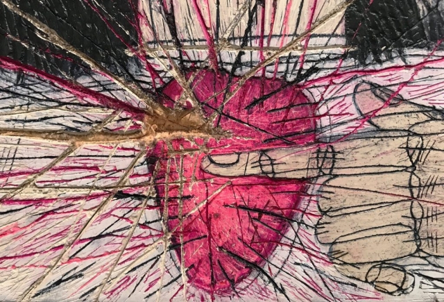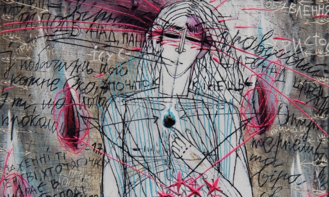 A number of details, such as the rose-colored cheeks (betraying the inner workings of love) or the use of verbal icons, show how seriously the artist is committed to the ancient tradition of Slavic iconography, when Kiev was the heart of Russia. Luz was undoubtedly one of the most important works in the exhibition at Pigment Gallery. While its formal composition follows the canons of the most ancient representations of the Transfiguration, it is also, in a certain way, revolutionary. Indeed, the boldness of the characters’ depiction, the seemingly chaotic ballet of lines (sometimes bordering on “rough art”), the expressive contrasts and the overload of undecipherable graffiti pay homage to street art.